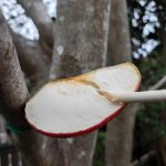 リンゴを枝に刺して鳥さんの餌にしようとしたのですが、全然食べません。どうしてかしらねー。気に入らないのでしょうか。 子供の頃、兄がおイモのふかしたのを枝に刺してメジロを捕まえいたのを思い出しました。 オイモの方が好きなのかねー。 せっかく高いリンゴを奮発して買ったのに、と言うか他に無かったのですが、ちょっと悔しいです。もしかして、日陰なので見つけられないのでしょうか。
