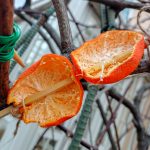 先日、鳥にリンゴをあげようと思って枝に刺して置いたにの全く食べないのでガッカリしましたが、ミカンはどうかと試したらしっかり食べました。 凄く綺麗に食べてありますね。 何故でしょうかね。 「鳥目」で薄暗くなると見えなくなるのでしょうが、鳥が色盲とは聞いてませんよね。リンゴは私が切って枝に刺したから白い中身が上、赤い皮は下になり目立たなかったのが要因ですかね。ミカンは強いオレンジなので目立ちます。 アッと言う間に鳥が来てドンドンつつきました。 果物の色、紅、オレンジ等目立って(ここが大事)ひきつけるのだと思いましたが合っていますか?