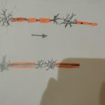 この変な絵は人間の脳の神経細胞のつもりです。 星のような細胞から繊維が伸びて次に伝えるようになっています。下手な絵で済みません。さて、ビックリしたのは、この細胞が情報を伝える早さで、新幹線並み、1秒100m、時速 360kmだそうです。凄いですね。脳の中を新幹線並みのスピードで駆け回っているなんて感激しました。赤く塗った処は1種の絶縁体ですが、これには切れ目があり、この切れ目を特急のように、飛び飛びで行くので、これが無いと1秒1