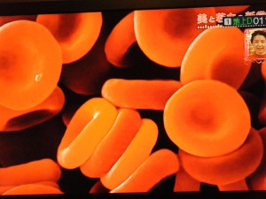 これは、赤血球という物なんですけど、ちょっと色が黄色過ぎるような気がしますね。 血の赤い色の元、とでもいうべきでしょうか。 いつもこれを見ると、お汁粉やミツマメに入っている白玉を思いだします。 白玉って知らないかしら? 白玉粉っていう粉を水でちょっとこねて、指先位の大きさに丸め、熱湯に入れて茹で、浮いて来たら出来上がりです。それの真ん中を抑えてへこませたって感じですね。 さあ、この赤血球は、私達の体中に酸素を運ぶ役目があり、足りなくなると、動悸、息切れ、疲れやすい、だるい、等の症状がでますね。これが足りなくなるのが、貧血で、思春期の女の子には結構多いですよ。良く、貧血と言うと所謂 「脳貧血」 「立ち眩み」 とも言いますが、急に立ち上がった事により、体の上に血液を送るのが間に合わなくて、クラッとするものを言う場合が多いのですが、医学的には、この赤血球が少なくなってしまった事を言いますよ。