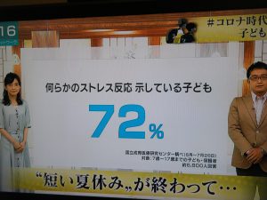 今年は特別になってしまいましたね。 夏休みが短かったので、暑いのに大変です。真っ赤な顔をして下校しているお子さんを見掛けます。連日のコロナの報道でお子さん達も恐怖心を抱いているようで、どうしたら安心できるか、お子さんを守れるか、工夫したいと思います。手を洗う事等は当然ですが、暑いのにマスクをしていれば余計暑いですし、学校で「向かい合っての話は避けて」なんて言われては、お子さんも戸惑うでしょう。ストレスを感じていても無理は無いと思いますが、お家でお子さんと話合って、状態に気を付けて下さいね。